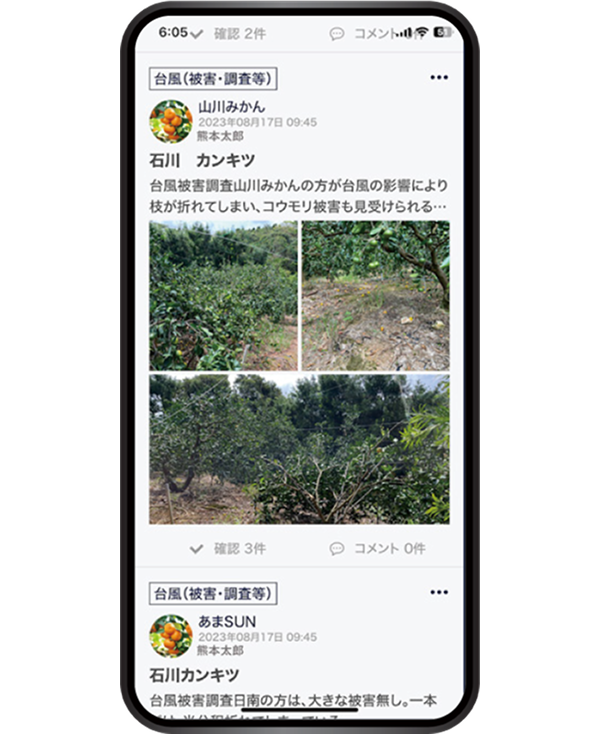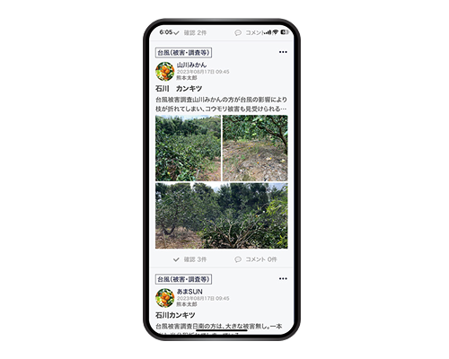 災害時や病害虫などの問題発生時は写真付きで投稿。現場の見える化で被害は最小限に!